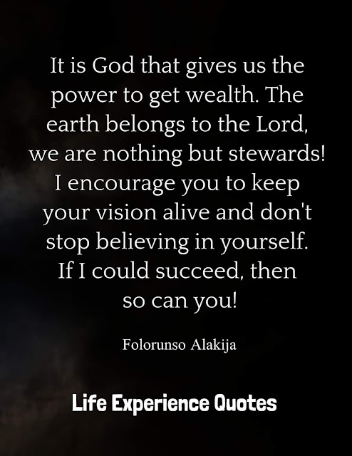 It is God that gives us the power to get wealth. The earth belongs to the Lord, we are nothing but stewards! I encourage you to keep your vision alive and don't stop believing in yourself. If I could succeed, then so can you! - Folorunso Alakija